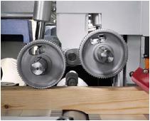 Taktovo riadené zrovnávanie na podporu manuálneho zrovnávania funguje tak, že vstupný podávací valec sa uvoľní potom ako druhý posuvný valec zachytí dielec. Po opustení druhého posuvného valca sa vstupný podávací valec dá do východiskovej polohy pre nasledujúci dielec.