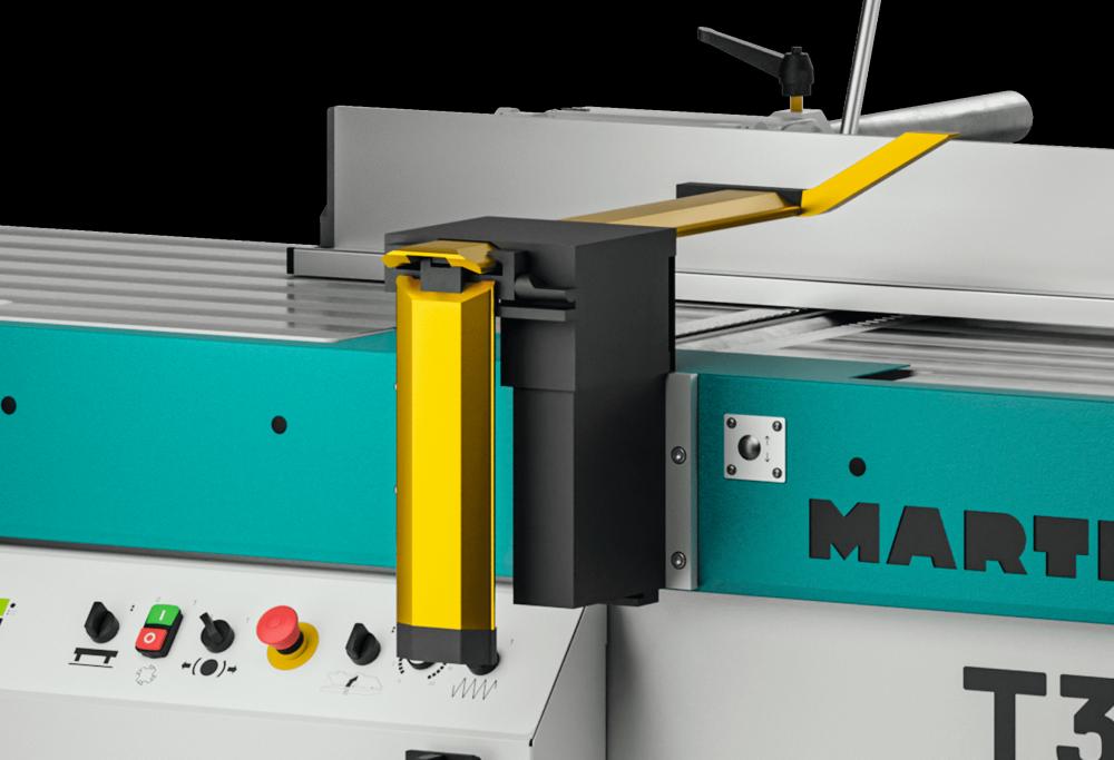 Zrovnávacie pravítko beží presne a bez nakláňania ponad stôl. Štandardný prídavný doraz je už integrovaný v zrovnávacom pravítku. Týmto spôsobom môžete bezpečne viesť aj malé, úzke obrobky cez stôl stroja T32.